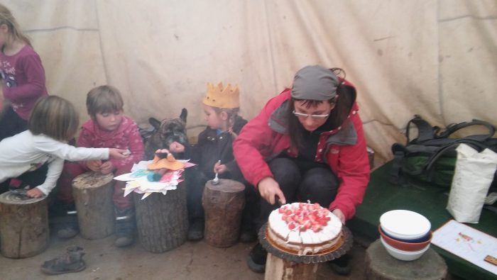 Po obědě přišla maminka Tereza s pejskem Edou a přinesli jahodový raw dort! Zatímco u ohně skřítek vyprávěl narozeninový příběh čtyřleté Žofky, Petra ušila malý pytlíček na narozeninový kámen. Než ten ale byl do pytlíčku uložen, putoval z ruky do ruky všech Žofčiných školkových kamarádů, všech průvodců, maminky. Žofka si ho pak nesla pěkně pověšený na krku domů:).