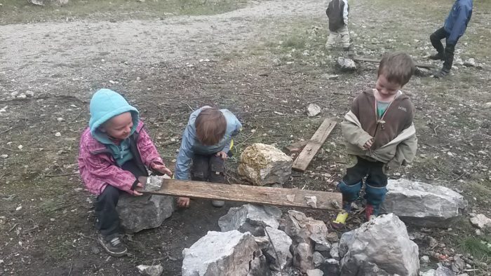 dnes to vypadalo na déšť, tak jsme si vyšli na krátkou procházku ze Srbska do bývalého lomu Chlum. Našli jsme tam několik převisů a jeskyněk a úkrytů mezi kameny, které se nám přijemném deštíku i větším lijáku hodily jako úkryt. Nasbírali jsme dříví, borovicové klestí a březovou kůru u vchodu do jedné jeskyně jsme si rozdělali ohýnek a poskládali jsme se k němu a pochutnali si na ještě horké dýňové polívce z papiňáku s domácím chlebíkem od Bětčiny maminky. Poděkovali jsem za jídlo pěkně jako jeskynní pralidé a to skřeky praskřeky a povídali jsme si o tom, co asi naši předkové pralidé potřebovali a o čem a jak zpívali. a když zas deštík polevil, s některými koumáky jsme si postavili opodál pravěkou váhu a vážili kameny velké a malé, blíž a dál od středu houpačky a vrstvili je a prostě jsme si tak hráli s gravitací. A za chvíli byl čas sestoupit do údolí k vláčku a ještě zbyl čas si pohrát na hřišti a orlové se slétli k sebrání dojmů z dnešního dne – a vidíte to nejdůležitější jsme zapomněla – našli jsme v jeskyni poklad – krystalky kalcitu, které nám Španďa rozbil kamenem a poprosili jsme Tondovu maminku Hanku, jestli by nám je do příště zadrátkovala, abychom měli na naší kůžičku další trofej.
