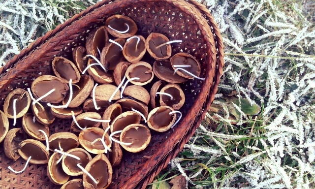 Klouzali jsme se a pozorovali zamrzlou krajinu. Voda v potoku tvořila krásné útvary… Některým to nedalo a rozbíjeli led kamením. V týpí jsme si rozdělali oheň a zahřáli se teplým čajem, který nám uvařila Norka. To jestli jste se divili, že děti měly lahvičky s čajem plné. Posilnění jsme se pustili do výroby skořápkových svíček. U ohně Španďa roztavil včelí vosk. Do vyloupaných skořápek jsme pak společně vkládali knot a zalévali je voskem. Dílo se nám podařilo, no posuďte sami. Každý si jednu loďku odnesl domů a zbylé jsme uschvali do košíčku na vánoční besídku.