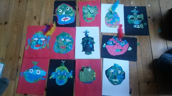 Vystřídala jí Markéta, která nám ukázala několik posmrtných masek z jadeitu neboli nefritu, které byly jako mozaika složeny z mnoha malých kousků vzácného kamene. My jsem si taky vytvořili vlastní koláže z různých odstínů modré a zelené barvy a níže vidíte, jak se nám povedly.